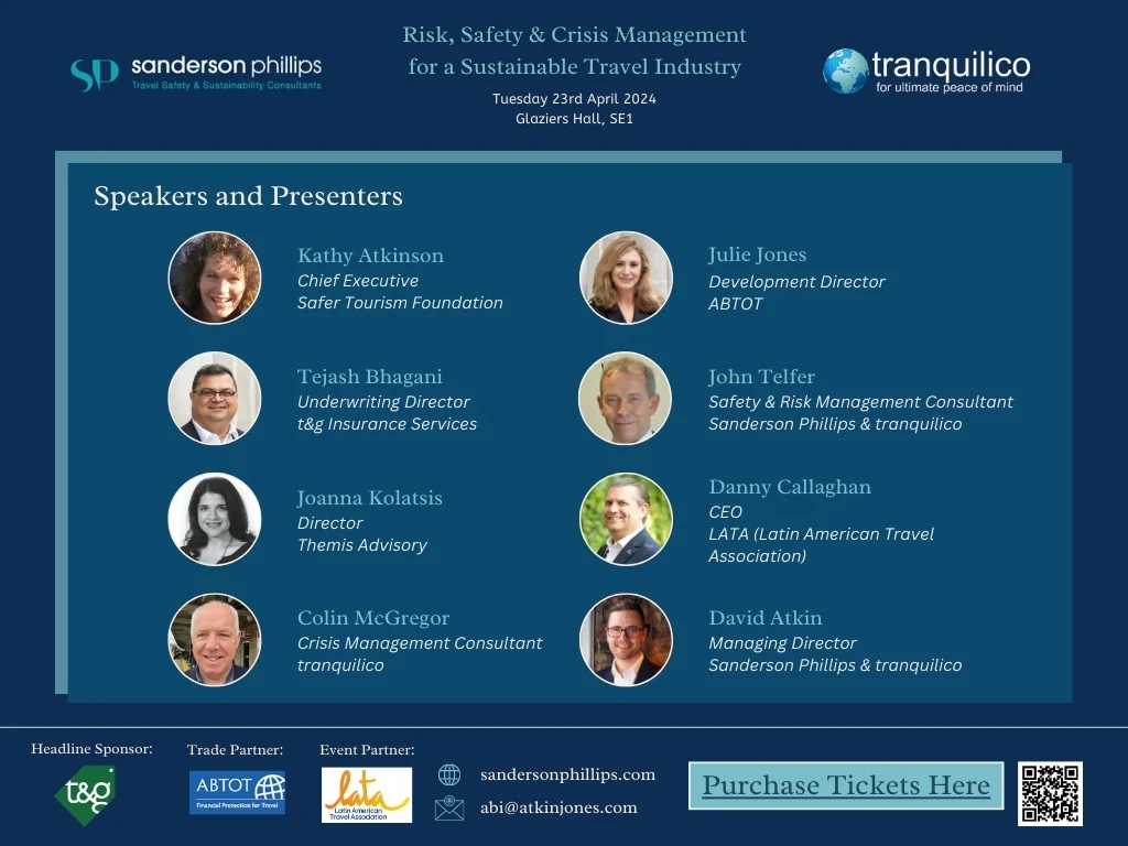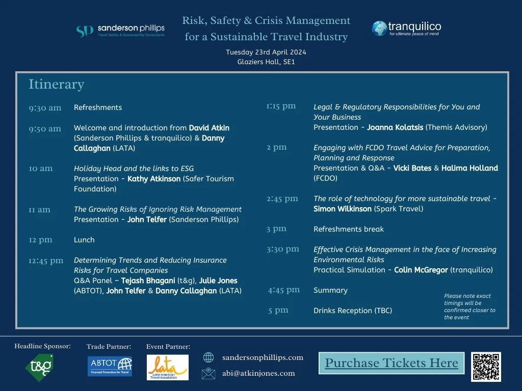This seminar is targeted at travel professionals involved in risk and operational management, customer experience and/or health and safety management for UK-based tour operators, travel providers, and other travel businesses.
